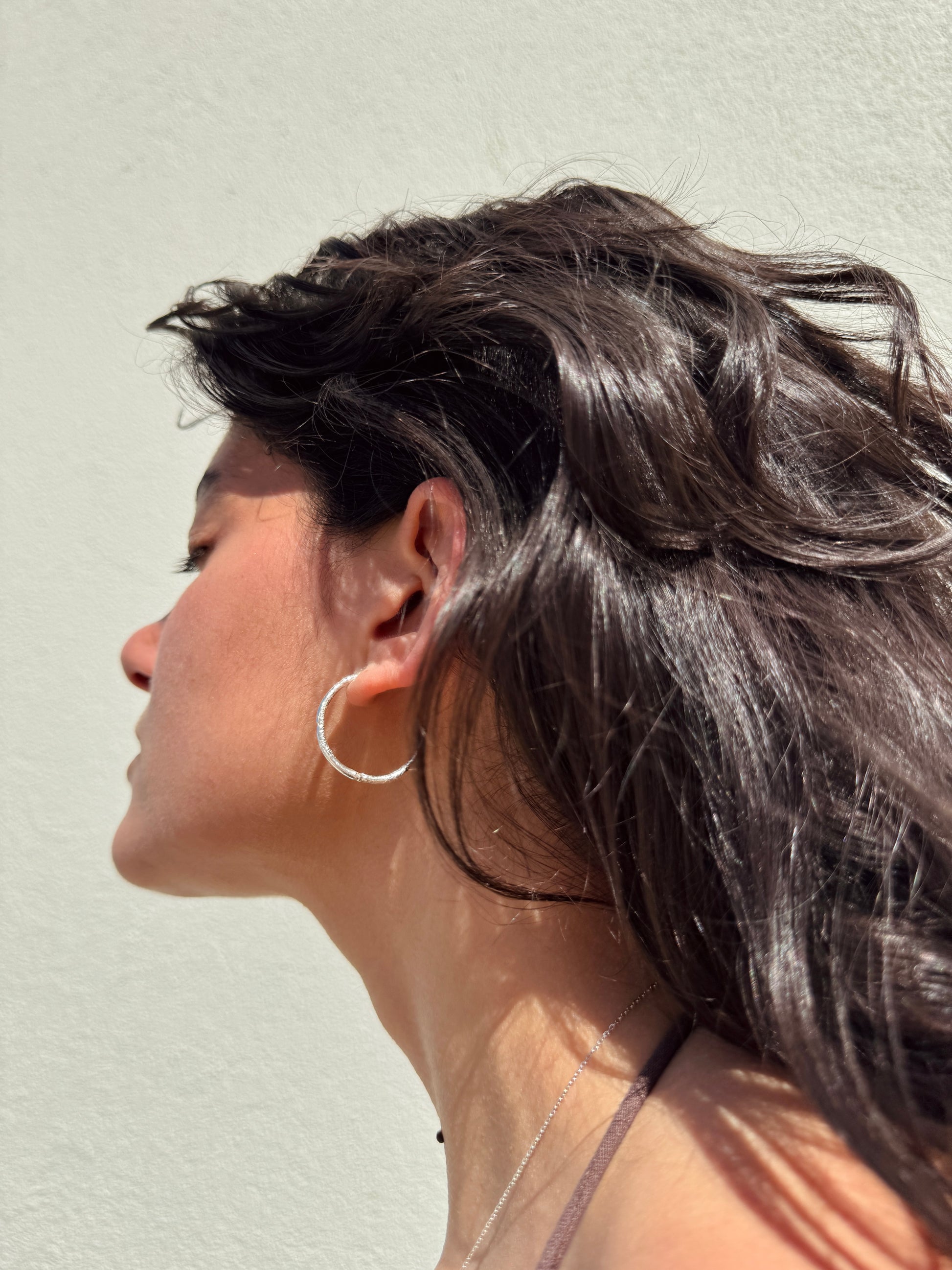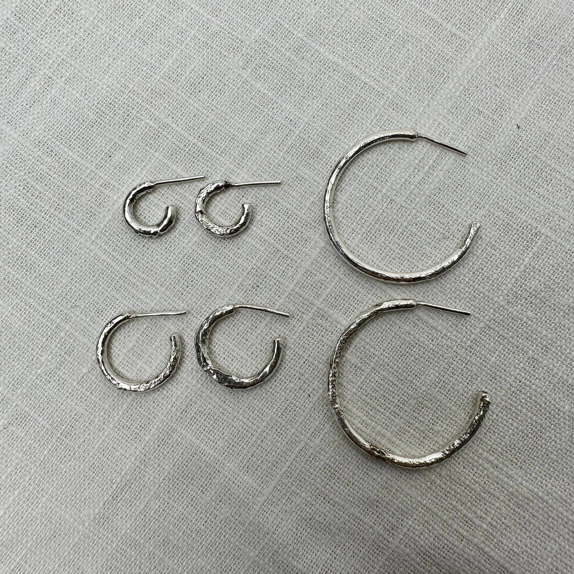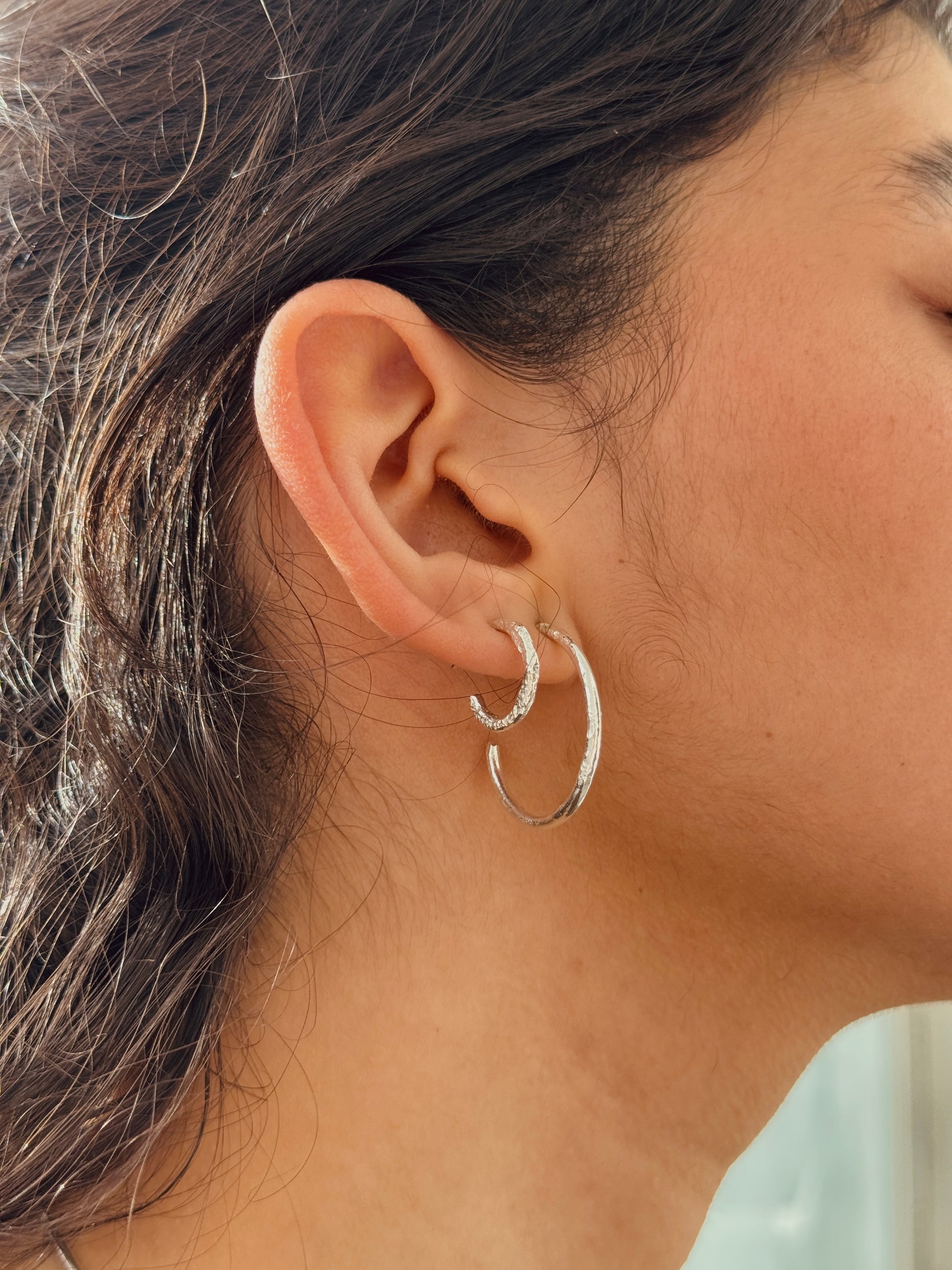 Fulgor é uma argola com textura de fogo, como se o metal ainda guardasse a memória do calor que o moldou. Disponível em três tamanhos (P, M e G) ou em trio para usar em layering.