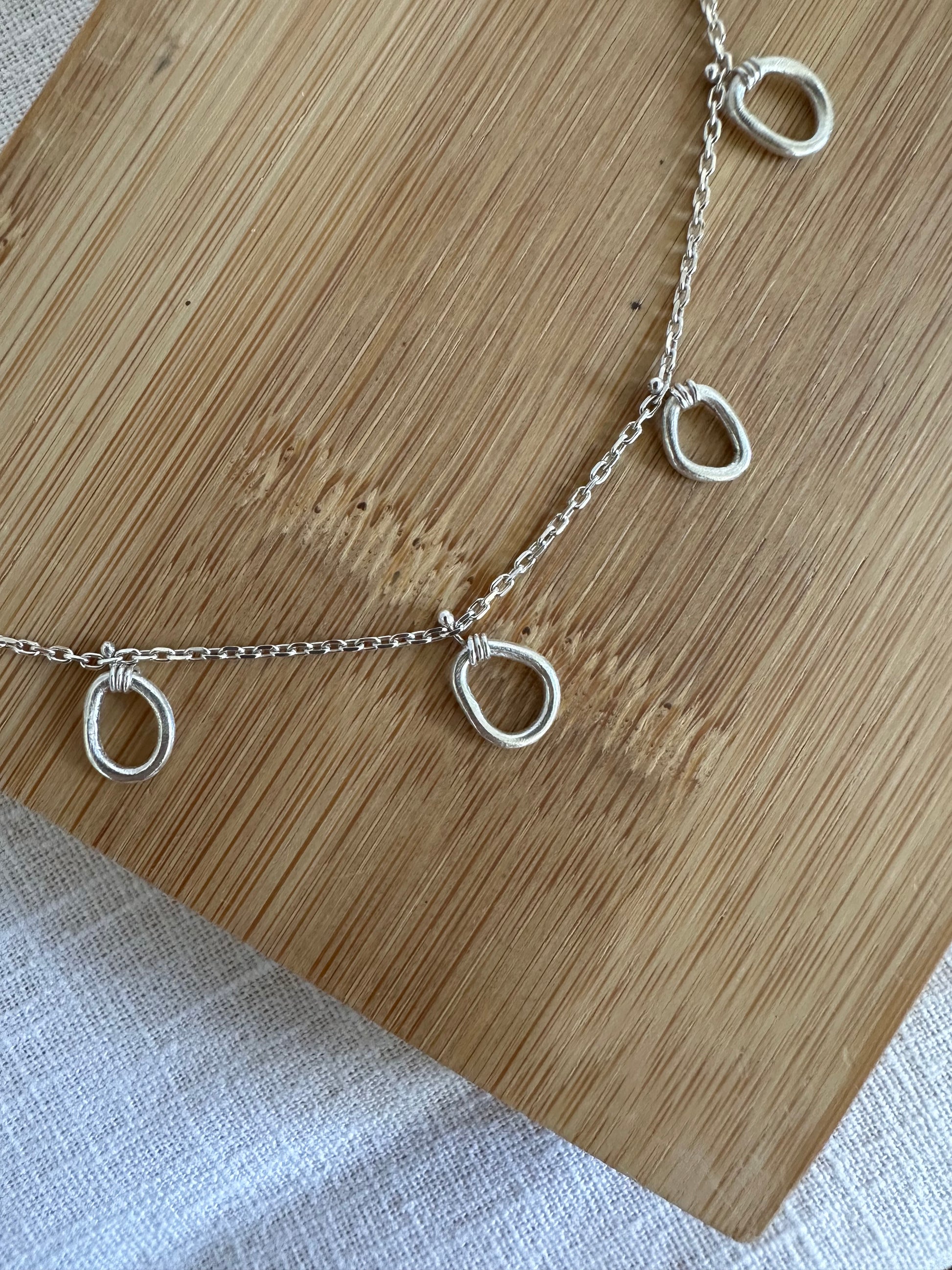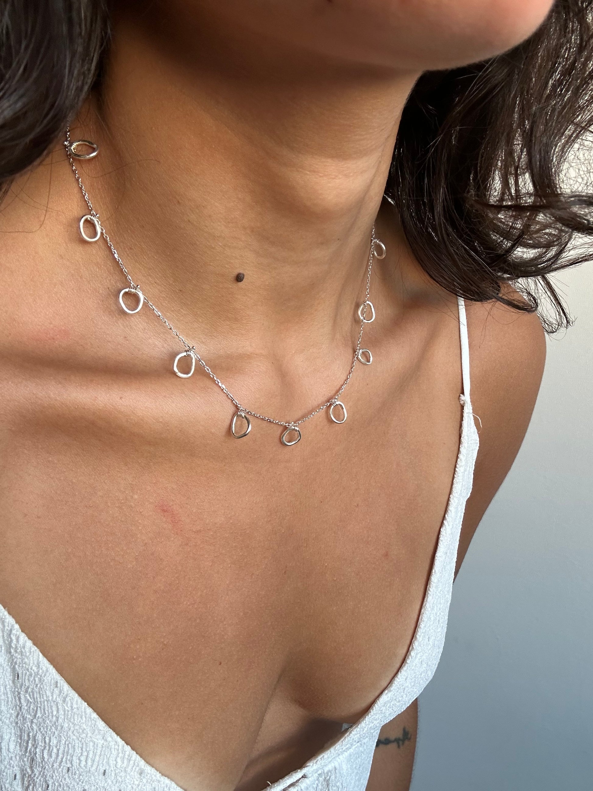 A choker delicada traz pequenos círculos orgânicos que dançam com o movimento, refletindo luz de forma sutil e elegante.
